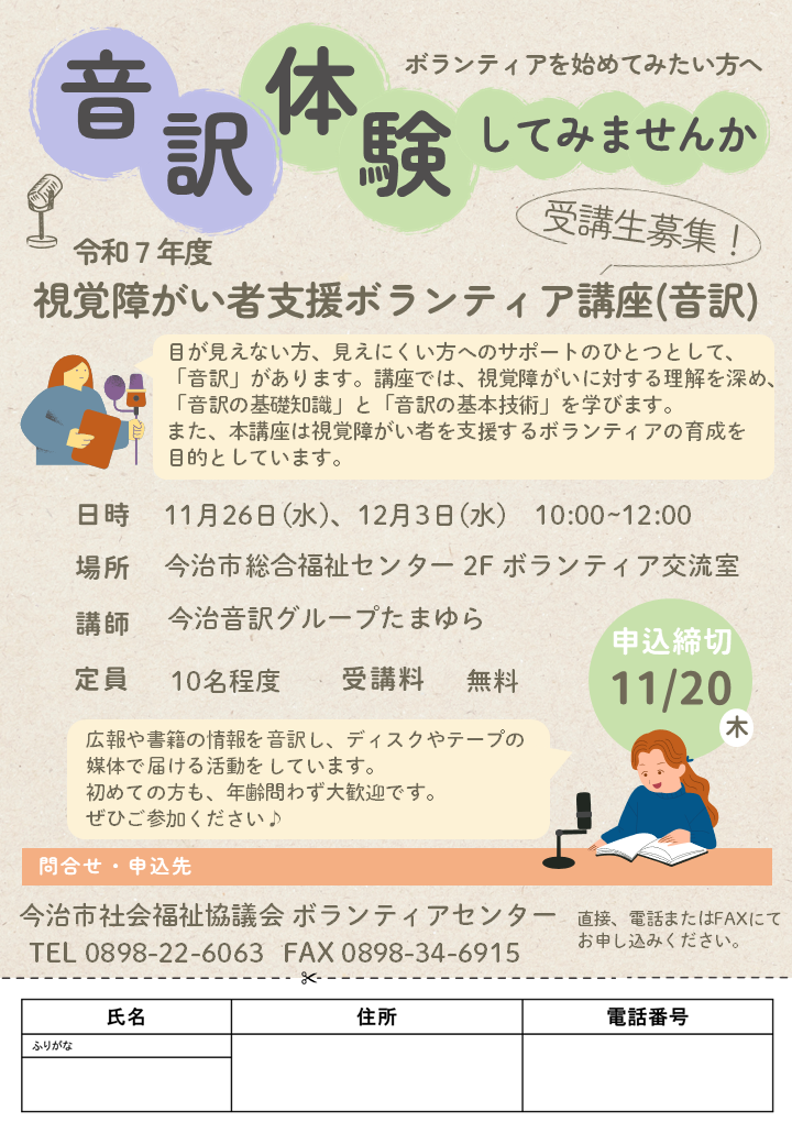 | 活動内容 | 目が見えない方、見えにくい方へのサポートのひとつとして、『音訳』があります。 私たちが普段何気なくふれている広報や図書、一般情報を視覚障がいがある方に届けるために、今治市内でも音訳ボランティアが活躍しています。 この講座は、視覚障がいに対する理解を深め、「音訳の基礎知識」と「音訳の基本技術」を学びます。 また、視覚障がい者を支援するボランティア育成を目的としています。 |