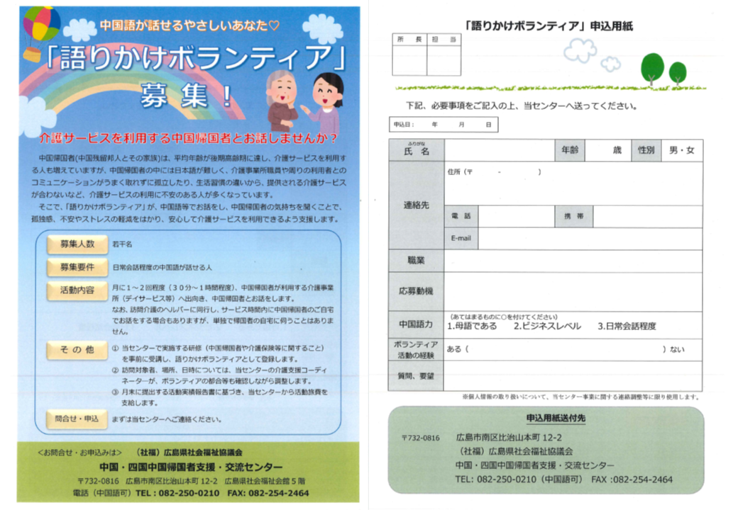 | 活動内容 | 中国帰国者(中国残留日本人)は、介護サービスを利用される機会が増えましたが、中国での生活が長かった 為、生活の言葉は中国語となっており、介護事業者での言葉の壁やコミュニケーションがうまく取れないなど 孤立するケースも少なくありません。 そこで介護利用時に、中国語を話せるボランティアを派遣し、コミュニケーションのお手伝いや中国語で寄り添うことで、孤立を軽減する支援です。その為に中国語を話せる「語りかけボランティア」を募集したいと思っております。 |